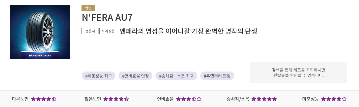 그 중 넥센엔페라AU7은 제동성능 최고! 승차감(소음) 최고! 주행거리 안정성, 연비효율을 인정받은 최고의 제품.